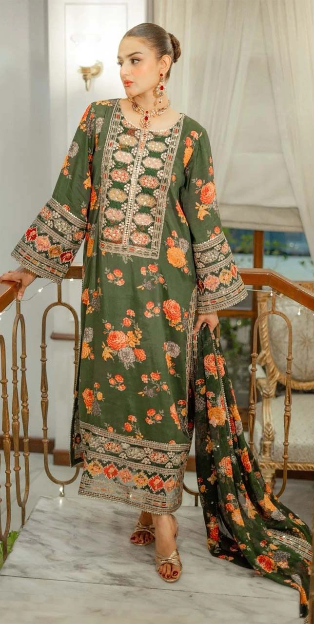 Elevate your wardrobe with the LUX-15 from Aneela’s. This exquisite 3-piece ensemble blends the comfort of premium lawn fabric with the sophistication of intricate embroidery. Featuring a deep moss green base adorned with vibrant floral digital prints, this outfit is designed for the woman who appreciates timeless elegance with a modern touch.