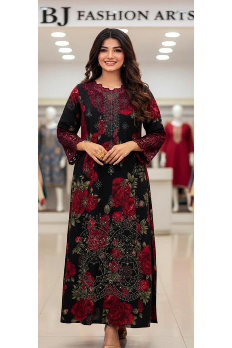 A rich and elegant 3-piece suit featuring a bold floral print, delicate sequins embroidery, and a soft chiffon dupatta. The deep tone base with blooming floral patterns creates a graceful festive look that feels both classic and eye-catching.